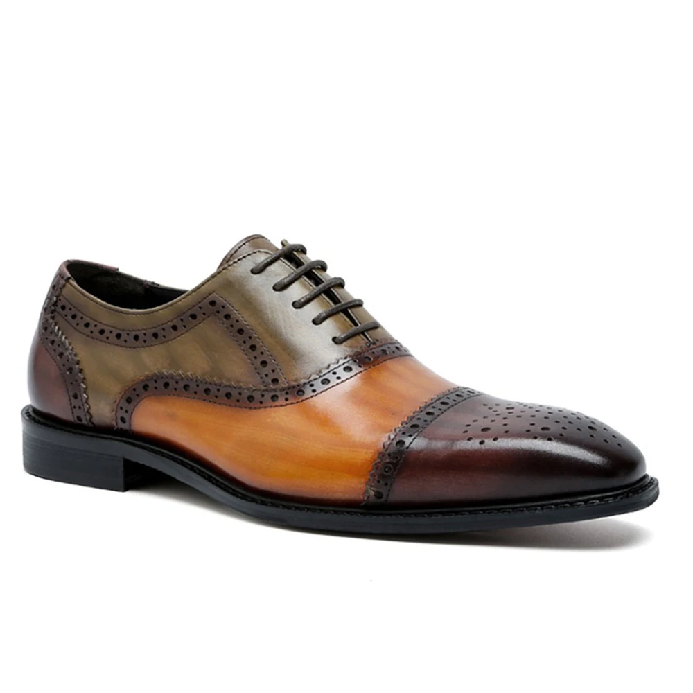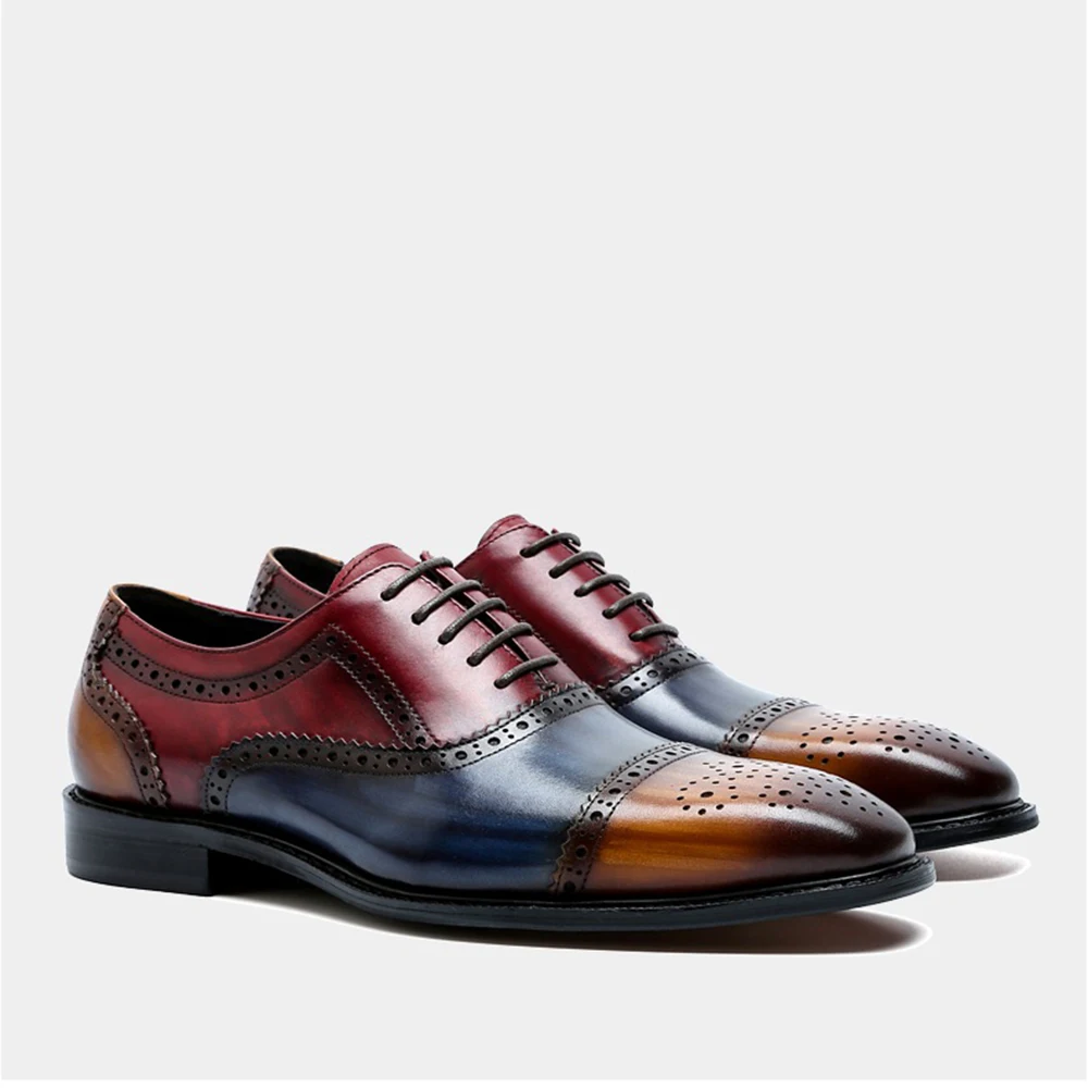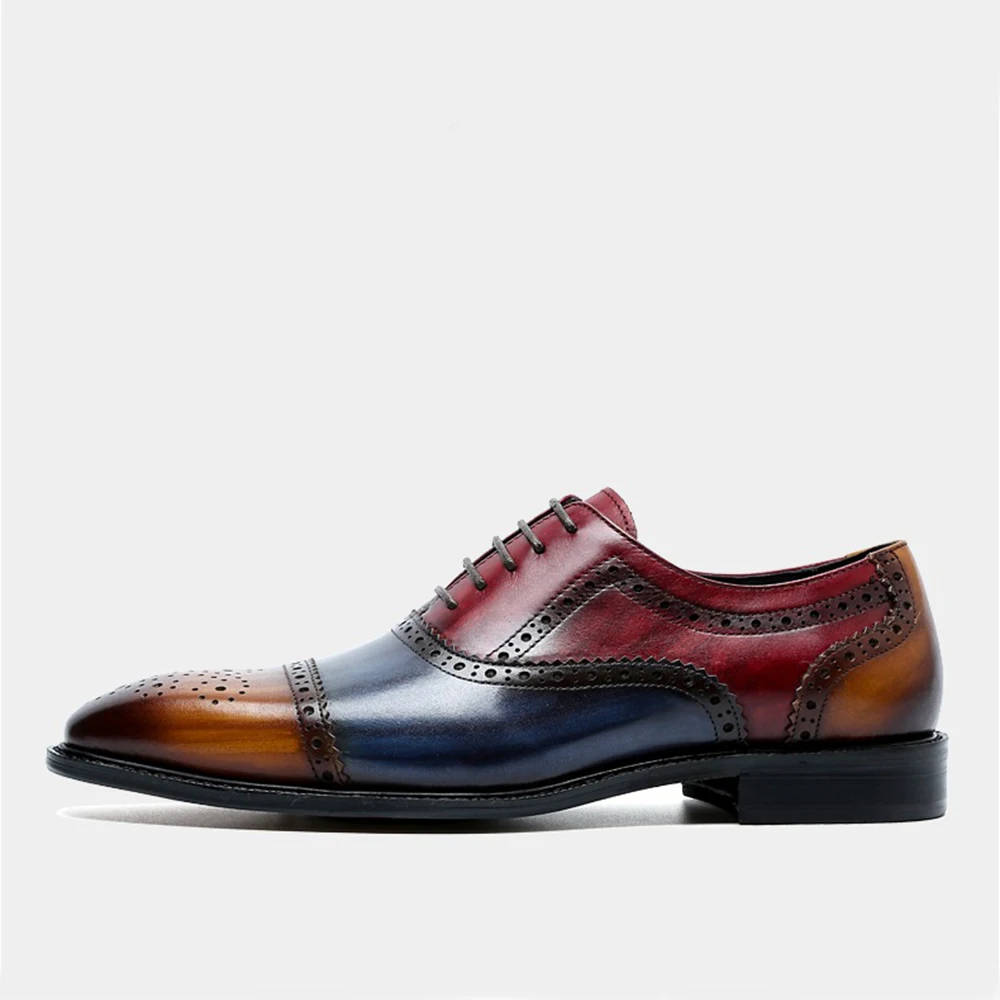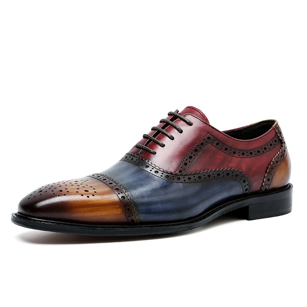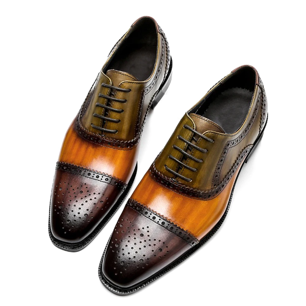 Color Block Genuine Leather Mens Formal Oxford Shoes Cap Toe Lace Up Brogue Business Party Elegant Gentleman Dress Shoes for Men