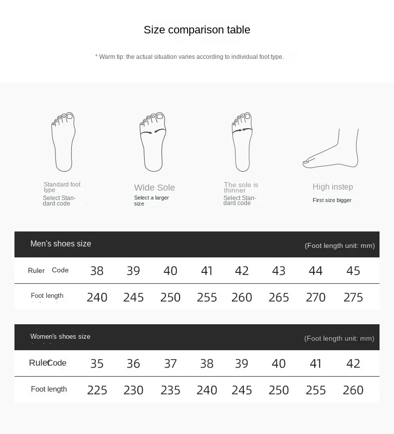 1. Please choose the appropriate size based on your actual foot length and circumference to avoid discomfort caused by inappropriate sizes.