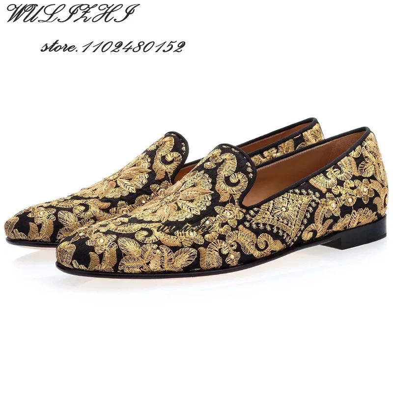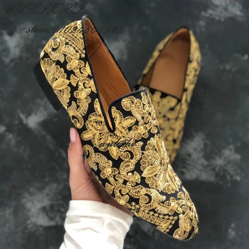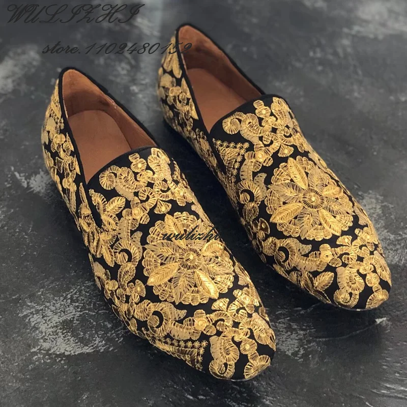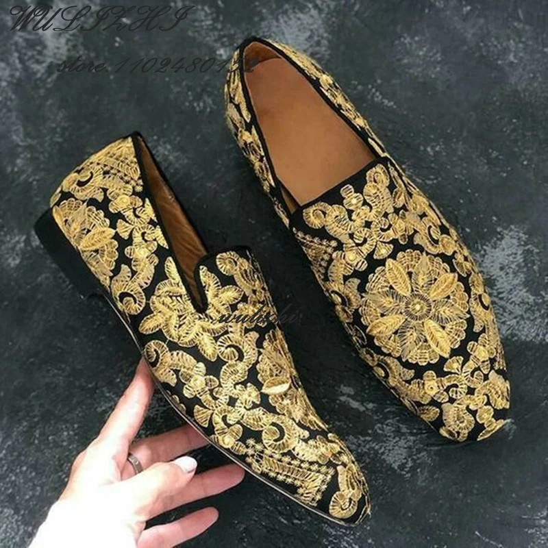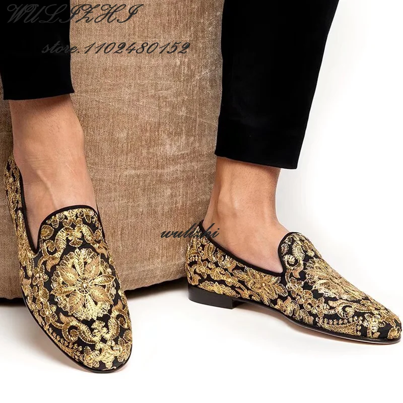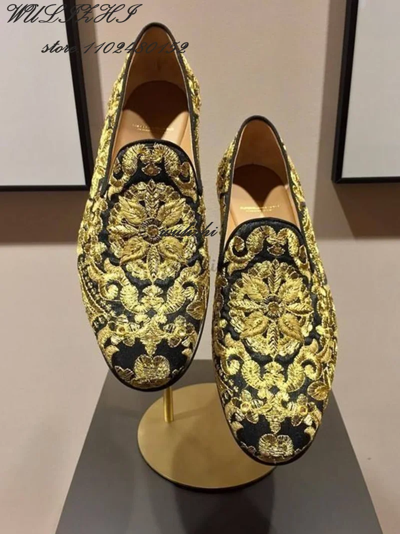 Yellow Totem Embroidered Gold Silk Sneaker Men Round Flat Soles Casual Sports Loafers Spring Party Oxfords Elegant Mules Wedding