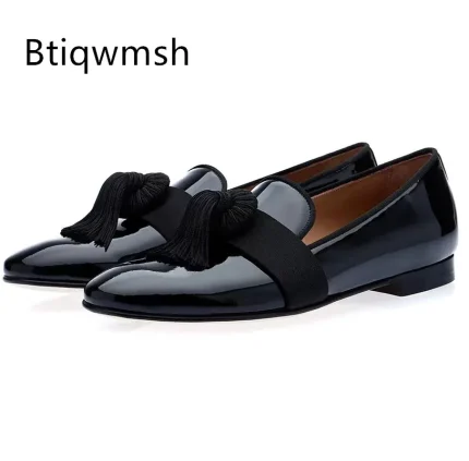 British Style Tassel Shoes Man Pointed Toe Black Leather Slip On Flats Man Fashion Party Shoes